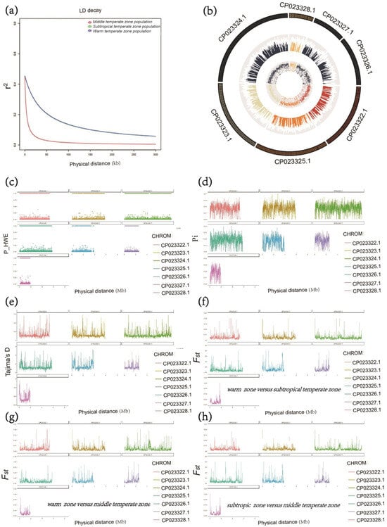 LD decay, SNP distributions and genome-wide differentiations occurred for or among the three populations of C. militaris. (a) LD decay plot for each population. SNP distance is on the X axis and r2 on the Y axis. LD decay was at the SNP distance when r2 decayed by half. (b) SNP distributions at each chromosome. (c) Hardy–Weinberg. (d) Pi. (e) Tajima’s D. (f) Population differentiation (Fst) for warm versus subtropical temperate zone in 10 kb nonoverlapping windows. (g) Population differentiation (Fst) for warm versus middle temperate zone. (h) Population differentiation (Fst) for subtropical versus middle temperate zone. Different colors represent alternative chromosomes, and Fst > 0.8 values were ascribed as Fst islands.