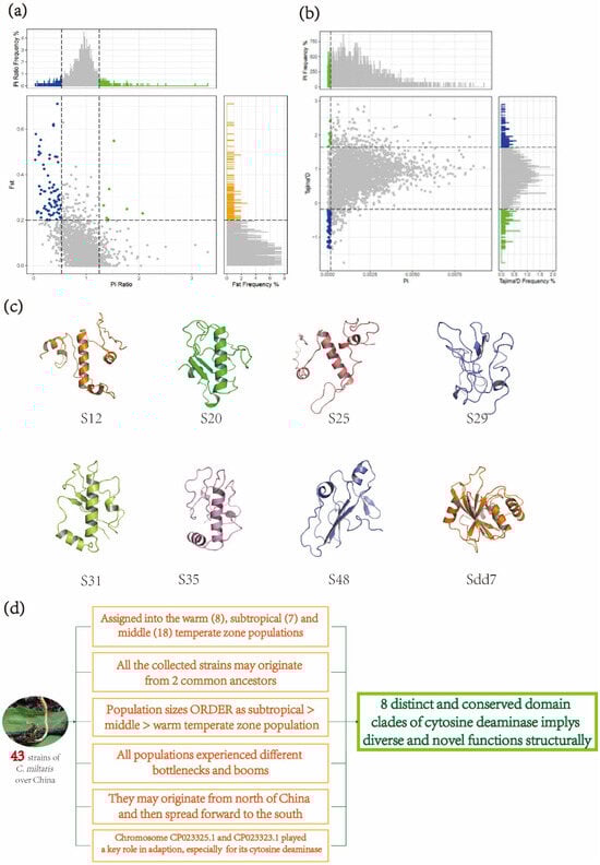 Correlations of diversity parameters and AI-assisted prediction and clustering of cytosine deaminases of collected C. militaris strains. (a) Fst and Pi correlation. The abscissa coordinate of the middle scatter plot represents Pi ratio distribution and vertical coordinate Fst, in which blue scatters represent the Pi over 0.95 or below 0.05, and blue area was the selected; the right plot represents the distribution of Fst, wherein orange area was over 0.95; the above plot indicates the Pi ratio distribution, in which the blue area was below 0.05. (b) Pi and Tajima’s D correlation. The abscissa coordinate of the middle scatter plot represents Pi distribution, and vertical coordinate Tajima’s D, in which blue scatters represent the Tajima’s D and Pi below 0.05, green scatters Tajima’s D over 0.95 and Pi below 0.05, and blue or green areas were the selected; the right plot represents Tajima’s D distribution, wherein the green area was below 0.05 and blue over 0.95; the above plot represents Pi distribution, in which the green area was below 0.05. (c) Representative predicted structures for eight deaminase clades. (d) Re-sequencing and AI-assisted structural predictions and alignments establish a new protein classification and functional mining method, providing a suite of cytosine deaminases of various activities and single- and double-stranded functions, potentially showing great probabilities as customed base editors, as therapeutics, or as tools for breeding novel species.