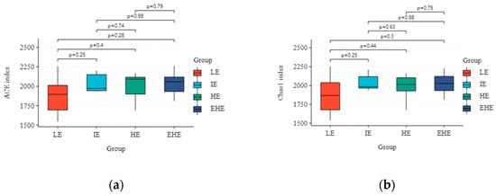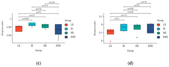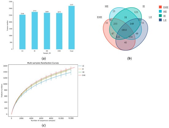 In total, 274,597 raw reads (an average of 13,730 sequences per sample) were obtained from bacterial 16S rRNA sequencing of 20 samples. In Figure 1a, it can be observed that the operational taxonomic unit (OTU) in the four groups was not significant (p > 0.05). The Venn diagram analysis of bacterial communities at the operational taxonomic unit (OTU) level disclosed that a core set of 1910 OTUs was consistently present across all groups. Furthermore, the analysis highlighted the presence of distinct OTUs within each group: 54 unique to the LE group, 122 to the IE group, 23 to the HE group, and 33 to the EHE group (Figure 1b). The rarefaction curve depicted the species diversity and species richness of each sample, which leveled off at 12,000 reads, demonstrating that the sequencing coverage was saturated (Figure 1c).