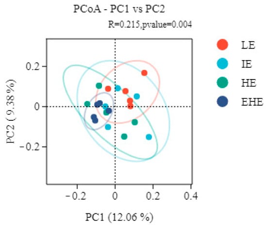 Beta diversity’s principal coordinate analysis revealed substantial variations in microbiota composition and structure under varying energy diets, which were evident from the two initial principal component scores contributing 12.06% and 9.38%, respectively, to the overall variations (Figure 3).