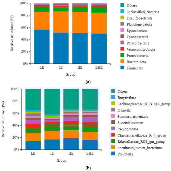 Relative bacterial abundance in rumen fluid samples at phylum (a) and genus (b) levels in Lanzhou fat-tailed sheep receiving diets with different energy levels. Only the top 10 phyla and the top 10 genera are shown (n = 5).