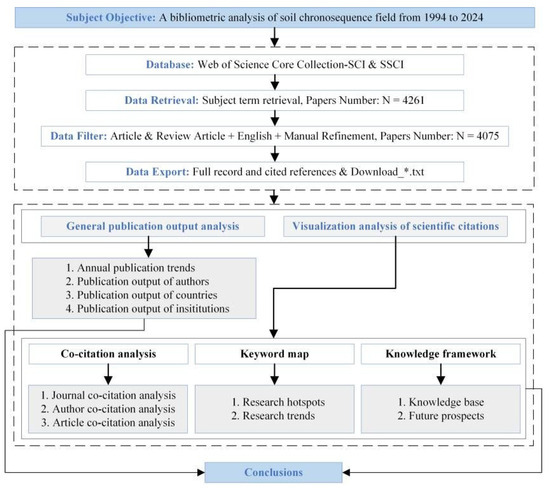 The data used in this study were obtained from the Web of Science Core Collection (WoSCC) database on 7 January 2025. We selected the Science Citation Index Expanded (SCIE) and the Social Sciences Citation Index (SSCI) of the WoSCC. The search term was set as “soil chronosequence”, with the search period spanning from 1 January 1994 to 31 December 2024. The language was specified as English, and the document types were designated as “Article” and “Review Article”. After eliminating the literature not related to the topic and filtering the duplicates, 4075 relevant articles were finally selected as the samples for analysis. The articles were then exported in “plain text” format, and the record content was set as “full record and cited references” to preserve complete records, including information on abstracts, keywords, and cited references. These articles were used to statistically analyze and draw knowledge maps of publication years, authors, journals, and keywords, among other aspects, in order to clearly reflect the research status and development trends in the soil chronosequence field. The search and analysis process is depicted in Figure 1.