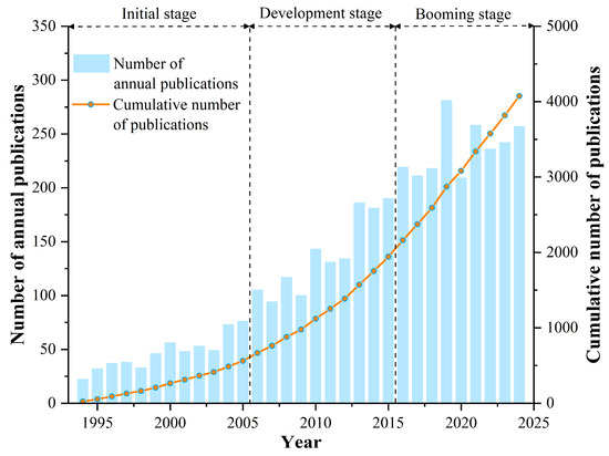 This study was based on data collected from the WoSCC database, which is known for its comprehensive research capabilities. A total of 4075 soil chronosequence publications were analyzed from 1994 to 2024, averaging approximately 131 articles annually. Overall, the number of publications exhibited a constant increase. Soil chronosequence research can be generally categorized into three stages: the initial stage, the development stage, and the booming stage (Figure 2). The initial stage (1994–2005) accounted for roughly 13.8% of the total publications on soil chronosequences. These early studies focused on the pedogenic process and application of dating methods such as Rb-Sr isotope dating [41,42]. These studies laid the theoretical foundations for future studies on soil development and enhanced the understanding of pedogenesis.