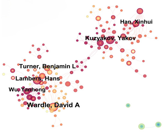 To explore global scholarly collaboration, we analyzed the author network in this field (Figure 3). It was observed that Lambers Hans had a strong cooperation relationship with Wu Yanhong from China and Turner Benjamin L. from Gyeongsang National University, Republic of Korea, while Wardle David A. was also found to collaborate with Turner Benjamin L. from the Republic of Korea and Fang Jingyun from China. This implies that these scholars have built strong collaborative relationships in the field of soil chronosequence studies. Their cooperative work has mainly focused on the biogeochemical process of nutrient mobilization during pedogenesis and primary succession along chronosequences, successional trajectories of soil microbiomes, and plant acquisition of nutrients along chronosequences [45,46,47,48].