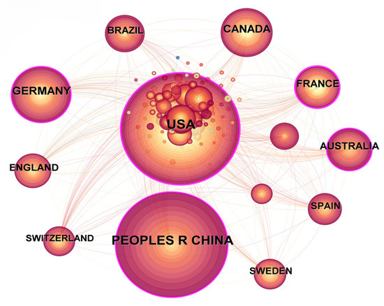 A network map of countries based on the collected literature was constructed, as shown in Figure 4, which consisted of 117 nodes and 906 links. The USA peaked with the highest centrality (0.34), followed by France (0.33), Germany and China (0.19), Australia (0.14), Brazil (0.09), and Switzerland (0.08). The USA has cooperated with almost all the other countries, including Germany, Canada, the UK, China, and Spain. China has also established close cooperation with many countries such as Switzerland, Spain, the USA, and France. These results indicated that the USA has contributed the most to the publications and that it also exhibits significant influence in the collaborative network.