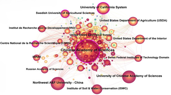 A map illustrating the networks among institutions involved in this research field is shown in Figure 5. It is composed of 574 nodes with 3331 connections in total. Figure 5 shows that the Chinese Academy of Sciences was the largest node, appearing the most frequently, which highlights its active collaborations across institutions. The Chinese Academy of Sciences engages in cooperative efforts with numerous institutions such as the CNRS, USDA, University of California, and ISWC. In terms of centrality, the Chinese Academy of Sciences stands out with the highest rating of 0.21. Other institutions, such as the University of California along with the Swedish University of Agricultural Science and the CNRS, also displayed high centrality values, in the range of approximately 0.12 to 0.19. The centrality of other institutions remained below 0.1, suggesting that their significance is moderate compared with the leading institutions.