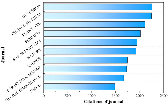 Top 10 most cited journals publishing soil chronosequence articles from 1994 to 2024.