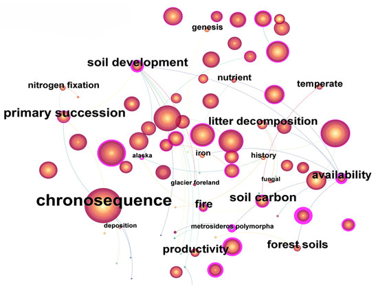 To explore the research hotspots, this study constructed the co-occurrence map of the keywords used in soil chronosequence research, as shown in Figure 7. There are 872 keywords occurring in the articles involving soil chronosequences, among which 22 keywords had a frequency of more than 200 (Figure 7).