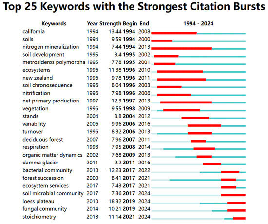 Top 25 keywords with the strongest citation bursts in soil chronosequence research from 1994 to 2024.