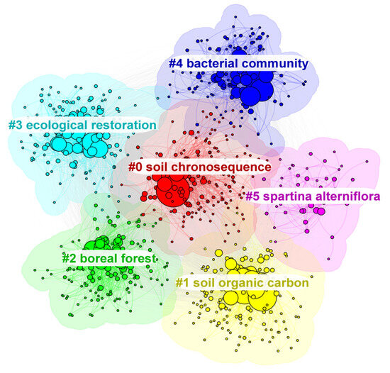 The keyword clustering map visualizes significant research topics in the soil chronosequence field, as presented in Figure 9. The largest cluster, soil chronosequence (#0), underscores the importance of understanding the formation and development of soil over time, which is fundamental for predicting soil behavior under different environmental scenarios and managing soil resources sustainably. Other notable clusters include soil organic carbon (#1), which is crucial for carbon sequestration and mitigating climate change, and bacterial community (#4), which emphasizes the role of soil bacteria in nutrient cycling and ecosystem health.