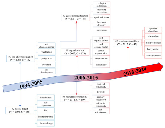 Building on our comprehensive analysis of soil chronosequence research, we observed various research dimensions and hotspots that are dynamically evolving. Therefore, a comprehensive trend map based on previous figures and keywords is presented (Figure 10). The knowledge base of this field has covered a wide range of topics, including soil chronosequences, ecological restoration, organic carbon, boreal forests, bacterial communities, Spartina alterniflora, blue carbon, mangrove forests, heavy metals, and chronosequences. These topics have evolved over time, reflecting the development and expansion of research interests in the field. In the period from 1994 to 2005, the research on soil chronosequences was mainly focused on the basic concepts and methodologies related to soil chronosequences (C = 182) [41,42]. This period laid the foundation for subsequent studies by establishing theoretical and methodological frameworks for understanding soil development over time. From 2006 to 2015, the field expanded to include topics such as ecological restoration (C = 154) and organic carbon (C = 173). These topics indicate a growing interest in the ecological implications of soil chronosequence research, particularly in terms of how soil development affects ecosystem services and carbon sequestration [83,84,85,86]. In the most recent period from 2016 to 2024, the research has further diversified into areas such as bacterial communities (C = 149), Spartina alterniflora (C = 47), blue carbon, mangrove forests, heavy metals, and chronosequences. These topics reflect the increasing recognition of the role of soil chronosequences in understanding microbial ecology, coastal ecosystem management, and the impacts of human activities on soil quality and environmental health [87,88,89]. In conclusion, the intellectual base of soil chronosequence research has evolved significantly from 1994 to 2024, with a growing emphasis on interdisciplinary approaches and practical applications. Future research in this field should continue investigating how soil development interacts with ecosystem dynamics while tackling urgent environmental challenges. Long-term monitoring and advanced technologies, such as remote sensing, GIS, and molecular biology methods, will be crucial to forecast soil dynamics and guide sustainable land management, thereby safeguarding soil quality and ecosystem resilience.