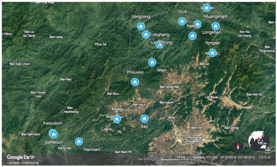 The study was conducted in 16 rural upland villages of Phoukhoud District, XiengKhouang Province of Lao PDR (Figure 1) where 97% of the households are subsistence farming households [13]. These rural households are small landholders who follow both traditional and modern agricultural practices and have a small size of operations to secure their livelihoods primarily through agricultural activities, with only a small percentage of households having access to diverse sources of income. Thus, these households are classified as vulnerable households based on the presence of multiple vulnerability dimensions such as remoteness, poor access to key services, seasonal food insecurity, proneness to financial hardship, higher prevalence of malnourished children, and exposure of livelihoods to natural disasters. Vulnerable households often are resource-poor, with various financial and health risks, have low coping and adaptive capacity to natural disasters [13,49,50,51,55,57], and are exposed to adverse climate change effects [25,58]. Overall, 25% of these rural farmers in the province are experiencing food insecurity, with a 21.5% poverty rate, which is the fourth highest in Lao PDR; 40% of children under 5 are chronically malnourished [25,47,59]; and they are exposed to significant unexploded ordnance contamination that continues to injure people and cause loss of life [60].