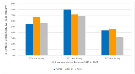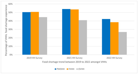 A food shortage reduction trend was noticed between 2019 (n = 504 VHH), 2021 (n = 425), and 2022 (n = 435) among three vulnerable HHs.