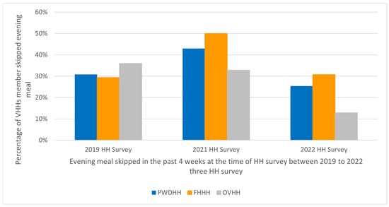 The study examined the extent of food shortage worries, the frequency of such concerns, and whether household members had to skip meals. Figure 3 demonstrates an overall average of 57% (67% of FHHHs, 56% of OVHHs, and 55% of PWDHHs) households in 2019, 72% in 2021, and 35% (46% of FHHHs, 44% of PWDHHs, and 32% of OVHHs) in 2022 were found to be anxious about the possibilities of food shortage. The overall percentage in 2022 demonstrated that VHHs were less worried about food shortages, but FHHHs and PWDHHs were worried more than OVHHs.
