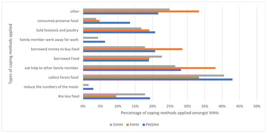 The findings highlight the diverse range of strategies employed by households to cope with food insecurity, with varying degrees of severity and impact on their food intake (Figure 5). About 17% of FHHHs, 6% of PWDHHs, and 3% of OVHHs reduced the number of meals, reflecting the critical need for immediate intervention and support and indicating the dire circumstances faced by these households. In addition to these measures, 52% of households, with the highest proportion being 59% of PWDHHs, 51% of OVHHs, and 33% of FHHHs, resorted to collecting food from forest areas. This foraging strategy highlights the resourcefulness of these households in accessing alternative food sources when facing food shortages. Furthermore, 43% of households (50% of FHHHs, 44% of PWDHHs, and 43% of OVHHs) sought assistance from other family members. This collaborative approach underscores the importance of social support networks in times of food crisis. Interestingly, 32% of households, including 34% of OVHHs, 33% of FHHHs, and 22% of PWDHHs, opted to sell their livestock.