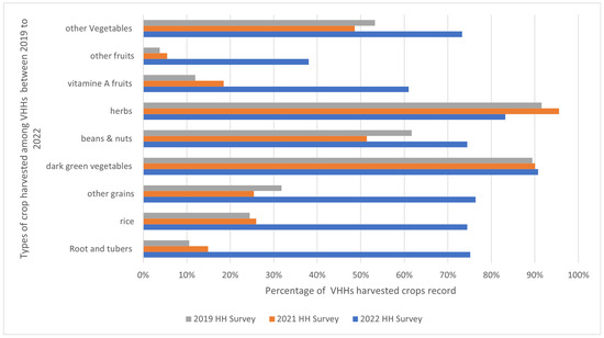 The study not only delved into the expansion and growth of home gardens but also meticulously explored the content of these gardens and the evolution of these trends over time. The study also revealed significant improvements in home garden crop diversity when comparing the 2019 and 2022 HH surveys across all three categories of VHHs (Figure 8). We found 83 types of edible plant-based crops distributed among 6 key groups: (1) root vegetables, tubers, and grains; (2) dark green vegetables; (3) legumes and nuts; (4) herbs; (5) fruits; and (6) other vegetables within these home gardens. An astounding diversity of plant varieties was discovered, including 26 different fruit varieties; 19 herb and spice varieties; 13 other vegetable varieties; 9 varieties of dark green vegetables; 8 types of grains, root vegetables, and tubers; and 8 varieties of legumes and nuts. PWDHHs cultivated 66 different varieties, FHHHs managed 55 varieties, and OVHHs maintained an impressive 74 varieties of edible plant-based crops. Interestingly, the two most favored groups of edible plant-based crops among all three types of households were herbs and spices and dark green vegetables. However, it is worth noting that the overall crop composition varied among these households, with OVHH households having the highest number of varieties, comprising 47% of the total, followed by PWDHHs (42.5%) and FHHHs (36%). This indicated that OVHH home gardens contained the greatest variety of products, while FHHH home gardens exhibited slightly fewer varieties compared to PWDHHs and OVHHs.