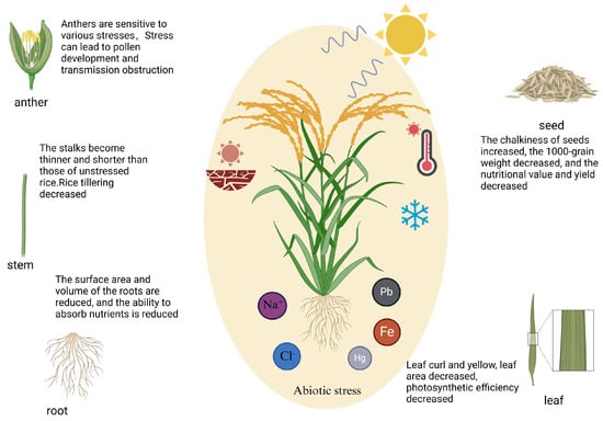 The impact of abiotic stress on rice growth and development. Different abiotic stresses, such as temperature, salinity, drought, and heavy metals, induce similar responses in various plant organs. For example, pollen fertility decreases, the number of tillers per stem is reduced, and root area shrinks. Ultimately, these stresses have detrimental effects on rice growth and quality formation.
