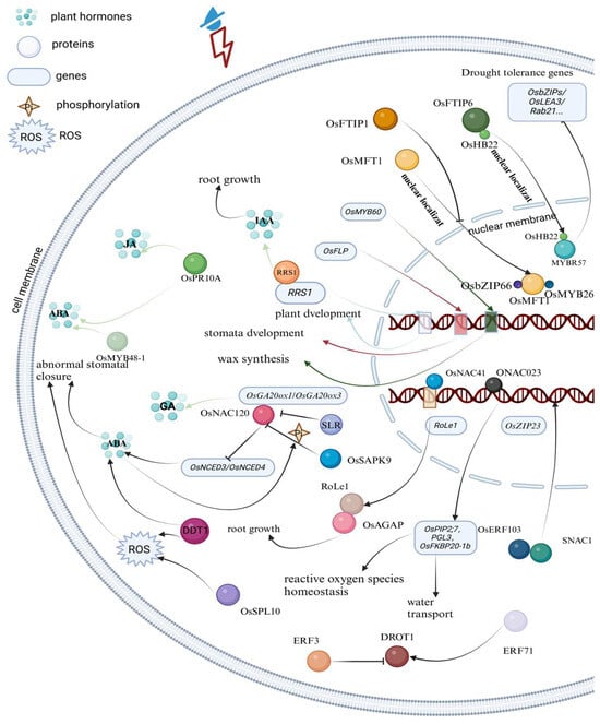 Under drought stress, the O. sativa NAC Domain Containing Protein 023 (ONAC023) participates in regulating drought tolerance in rice by binding and controlling multiple downstream genes. It enhances drought resistance by regulating the balance of reactive oxygen species (ROS) and genes related to water transport, such as O. sativa Plasma membrane Intrinsic Protein 2;7 (OsPIP2;7), PGL3, and O. sativa FK506 Binding Protein 20-1b (OsFKBP20-1b) [27]. The APETALA2/ethylene response factor O. sativa Ethylene Responsive Factor 103 (OsERF103) interacts with stress-responsive NAC1 (SNAC1) to regulate the downstream drought-resistance gene OsZIP23, thereby enhancing rice’s drought tolerance [27,28].