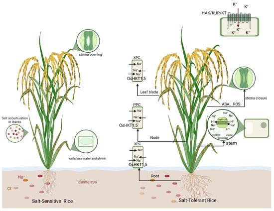 Contrasting responses of salt-tolerant and salt-sensitive rice lines to salt stress. Salt-tolerant and salt-sensitive rice lines exhibit notable physiological and molecular differences under salt stress. Salt-tolerant plants develop more robust root systems compared to their sensitive counterparts. To mitigate salt stress, these plants produce elevated levels of ABA and ROS, which promote stomatal closure and enhance salt tolerance. The gene OsHKT1;5, predominantly expressed in the Xylem parenchyma cells (XPCs) of leaf tips and roots and in the Phloem parenchyma cells (PPCs) of stem nodes, facilitates the removal of Na+ from the xylem. The OsNHX2 gene, encoding a Na+/H+ antiporter located in the vacuolar membrane of flag leaf sheaths, stems, and panicles, sequesters excess Na+ into vacuoles, effectively reducing intracellular Na+ concentration while exporting H+ to maintain osmotic homeostasis. Additionally, the High-Affinity K+/K+ Uptake Permease/K+ Transporter (HAK/KUP/KT) K transporter family, a group of twelve transmembrane proteins located on the plasma membrane, plays a crucial role in absorbing K+ from the environment, thereby minimizing Na+ uptake by cells. In contrast, salt-sensitive plants are severely affected by osmotic and ionic stress induced by salt, resulting in cell shrinkage, stunted growth, and significant yield reductions.
