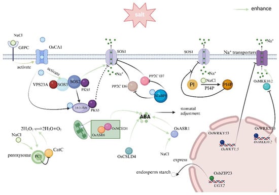 Molecular switches within the cell also play a role in regulating rice’s salt tolerance. For example, catalase (CAT) reduces hydrogen peroxide accumulation through disproportionation, thus enhancing stress resistance. On the other hand, peroxisomal phosphatase PC1, which is induced by salt stress and hydrogen peroxide, interacts with CAT to reduce its enzyme activity, negatively regulating salt tolerance [67].