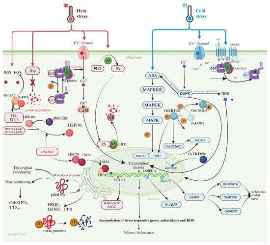 The functions of these genes and their regulatory pathways often extend beyond cold stress. For example, OsSAPKs not only positively regulate cold tolerance by phosphorylating the cyclic nucleotide-gated ion channel OsCNGC9 [119], but also participate in various other biological processes. Similarly, OsICE1 (OsbHLH002) exhibits multifunctionality across different stress responses.