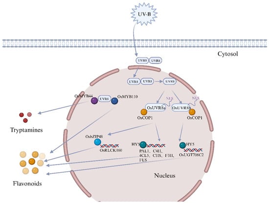 UV-B stress-related gene signaling pathway. Under UV-B stress, the UVR8 photoreceptor, located in both the cytoplasm and nucleus, dissociates into monomers. OsUVR8a and OsUVR8b, through their nuclear localization signal (NLS) at the C-terminal, are continuously localized in the nucleus. The interaction between UVR8 and COP1 activates the transcription factor HY5, which in turn regulates the expression of downstream genes such as PAL1, C4H, CHS, F3H, 4CL5, and FLS. Additionally, this interaction induces the expression of OsUGT706C2, and the transcription factor OsRLCK160 interacts with OsbZIP48, both of which promote the accumulation of flavonoids and enhance UV-B tolerance.