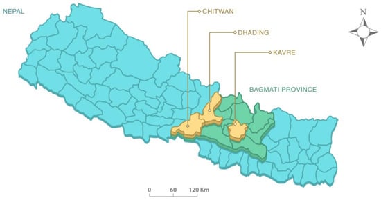 The selected study sites represent the province’s agro-ecological diversity. Kavre is a mid-hill district, and the surveyed area is in a montane region at higher altitudes, where temperate-zone farming practices are prevalent. Dhading, also a mid-hill to mountain district, has its survey area at lower altitudes, close to a highway, within the temperate zone. In contrast, Chitwan, located in the subtropical plains, serves as an agricultural hub with intensive farming systems. Together, these three districts capture distinct environmental conditions and farming practices within Bagmati Province, providing a comprehensive perspective on the challenges and opportunities associated with promoting sustainable farming practices and gender empowerment in agriculture (Figure 1). By focusing on these diverse agro-ecological zones, this study aims to contribute valuable insights into policy development and targeted interventions for scaling up ECA adoption and supporting women farmers in sustainable agriculture.