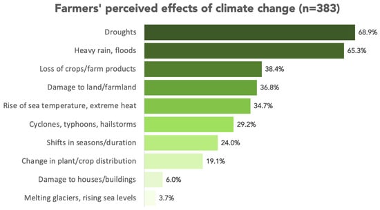 The majority of farmers (84.6%) reported their farming practices were affected by climate change (Figure 2), with drought being the most commonly cited impact (68.9%), followed by heavy rain and flooding (65.3%). Other reported effects included damage to crops or farm products (38.4%), damage to farmland (36.8%), and extreme heat days (34.7%). A smaller proportion of farmers cited changes in seasonal duration (24.0%), cyclones and hailstorms (29.2%), and changes in crop distribution (19.1%). Less frequently mentioned were damage to houses or buildings (6.0%) and melting glaciers or sea-level rise (3.7%).