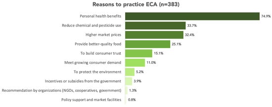 The perceived benefits of switching to ECA included health improvements (68.7%) and the potential for higher prices (45.2%). Other reasons were reducing the cost of chemicals and pesticides (27.9%), supplying better-quality food (29.2%), and meeting growing demand (15.9%). Farmers also believed ECA could build trust with consumers (11.0%), improve the local and global environment (4.2%), and enhance sustainability. However, awareness of FAO’s promotion of ECA was limited, with 62.1% of participants being unaware of such efforts.