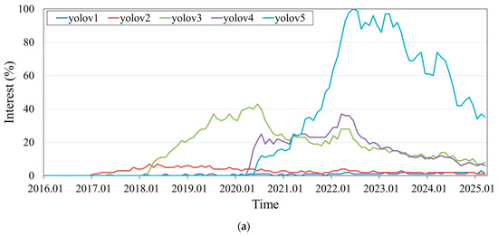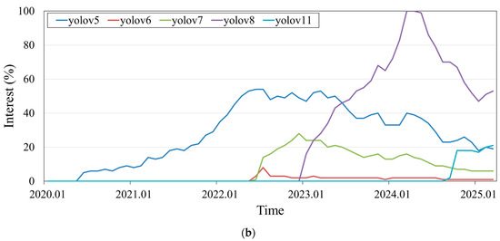 Figure 1. Global interest analysis of Google Trends: (a) yolov1~v5 and (b) yolov5 onward.