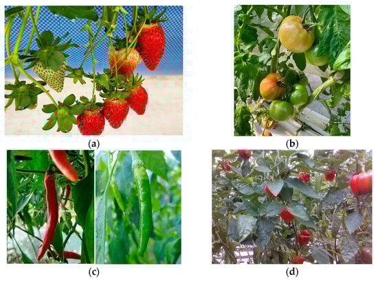 Figure 2. Original image sample: (a) strawberries, (b) tomatoes, (c) chilies, and (d) peppers.