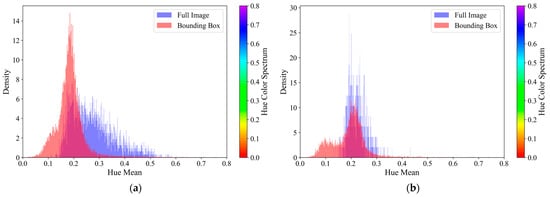 The strawberry dataset consisted of 3386 images and 23,359 labels, each with an average pixel count of roughly 1.39 million. On average, the bbox area occupied 1.31% of the image, ranging from a minimum of 0.0001% to a maximum of 19.19% (Figure 4a and Figure 5a). The mean hue of the entire image was 0.27, suggesting a predominance of green tones, whereas the mean hue within the bboxes was 0.19, indicating stronger red tones. This discrepancy implies that green elements probably dominated the background, whereas red elements (such as strawberries) were more pronounced within the bboxes. A histogram (Figure 6a) further illustrates this point. While green hues dominated the entire image, a concentrated red hue appeared within the bboxes.
