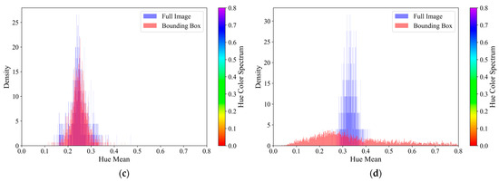 Figure 6. Comparison of mean hue distributions for full image and bounding box: (a) strawberries, (b) tomatoes, (c) chilies, and (d) peppers.