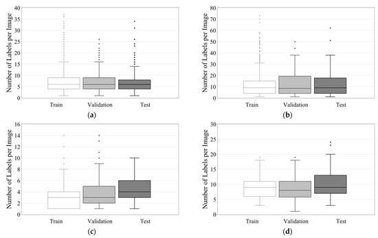 Further adjustments were made to ensure even distribution of labels (objects) in each image. Along with bbox–based grouping, the number of labels per image was calculated, and the label counts were balanced across the training, validation, and test sets. Specifically, for each group (small, medium, and large), the label count distribution was considered to minimize variations when splitting the data [42,44,45,46]. This step prevented any single set from being overpopulated by images containing numerous labels. Ultimately, the training dataset included at least 1400 labels, the validation dataset included at least 600 labels, and the remaining data were assigned to the test set (Table 6 and Figure 7).