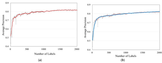 where x and y represent the number of labels and the model’s performance metric (average precision (AP)), respectively. The fitting coefficients a, b, c, and d were calculated based on the given dataset (x, y) using nonlinear least-squares optimization via the curve_fit function available in the Python SciPy library (Figure 9).