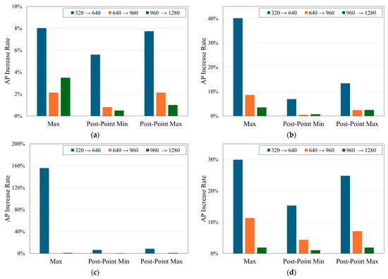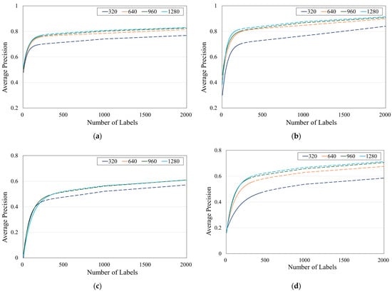 In this study, 16 model groups were constructed and analyzed by varying the image sizes (320, 640, 960, and 1280) for four crops—strawberries, tomatoes, chilies, and peppers—and incrementally increasing the number of labels. A systematic analysis was conducted using these experimental groups, specifically employing a total of 4800 YOLOv8 model groups (1200 per crop) to comprehensively evaluate performance. Figure 10 shows that the performance improved as the number of labels increased. However, the rate of improvement tended to decrease beyond a certain threshold. Furthermore, the performance gains were most prominent when the image size was increased from 320 to 640, whereas further increases in the size to 960 and 1280 yielded only marginal improvements. The incremental benefits of adding labels gradually diminished when weighed against additional computational costs. Although a larger size contributed additional information and could thus improve performance up to a certain level, any gains beyond that had limited value, owing to increased resource demands.