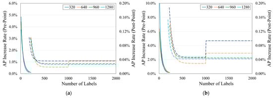 Figure 15. YOLOv8 and v11 AP performance and knee points of models based on image size and label count (image size = 640; solid line = pre-group; dotted line = post-group): (a) strawberries, (b) tomatoes, (c) chilies, and (d) peppers.