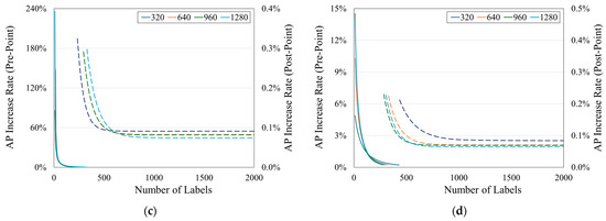 Figure 10. YOLOv8 AP performance and knee point of models based on image size and label count (solid line = pre-group; dotted line = post-group): (a) strawberries, (b) tomatoes, (c) chilies, and (d) peppers.