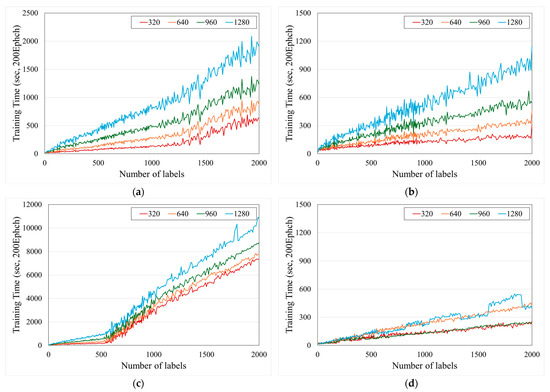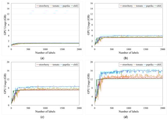 Figure 14. YOLOv8 GPU usage of the model as a function of the image size and number of labels: (a) 320, (b) 640, (c) 960, and (d) 1280.