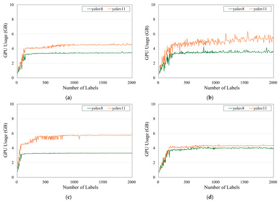Figure 16. YOLOv8 and v11 GPU usage of the model as a function of image size and number of labels(image size = 640): (a) 320, (b) 640, (c) 960, and (d) 1280.