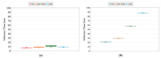 Figure 17. Inference times of the models as a function of image size: (a) Jetson Orin Nano and (b) desktop system.
