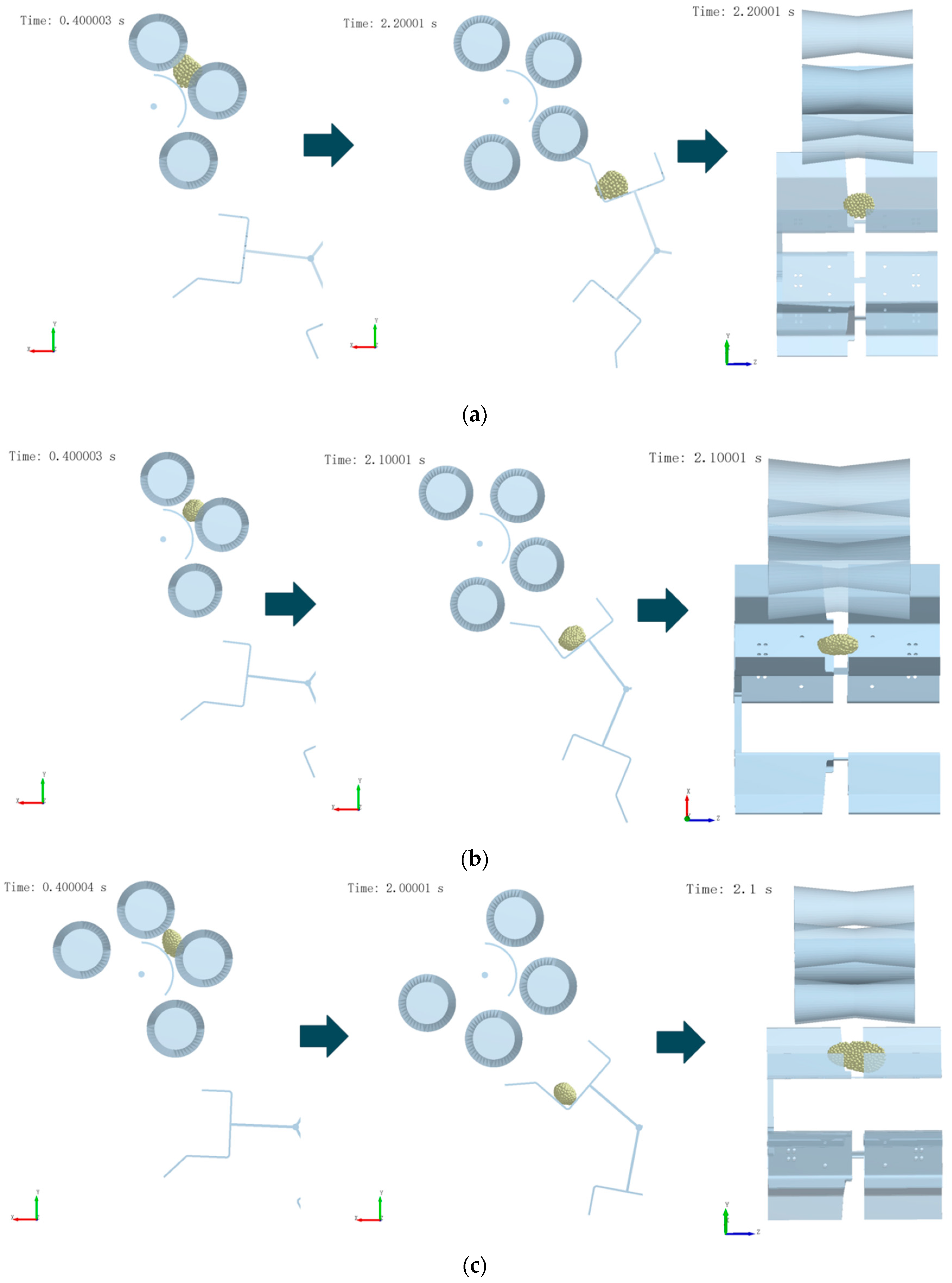 From the simulation of the seed potato conveying and posture adjustment process, it is evident that when the speed ratio is 5:8 and the rotating speed of cone table roller does not exceed 25 r/min, the initial positions of the roller and the baffle can be determined, to ensure that all three types of seed potatoes (small, medium, and large) fall smoothly into the secondary baffle mechanism without any change in posture.