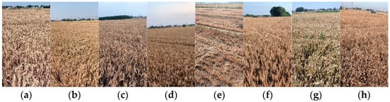 Figure 1. Examples of wheat variety images. (a) Jimai 38; (b) Jingdong 18; (c) Jinghua 11; (d) Lanmai; (e) wheat stubble; (f) Shixin 633; (g) Yudancheng 339; (h) Zhongxinmai 8.