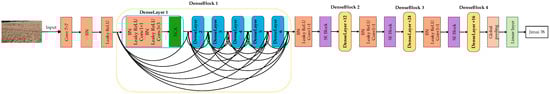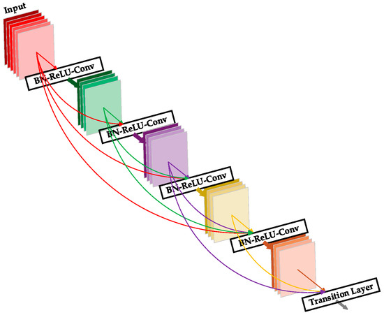 Inspired by the residual connection mechanism in ResNet [25], Gao Huang et al. [26] proposed DenseNet in 2017, a network architecture based on dense connections. The key innovation of this approach lies in its “Dense Connectivity” mechanism, where each layer is not only directly connected to its preceding layer but also receives the outputs of all the earlier layers as input. This ensures that every layer in the network maintains connections with all the preceding layers, facilitating feature reuse and improving gradient flow. The corresponding formula is as follows: