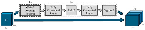 The Squeeze-and-Excitation (SE) module is a neural network architecture that emphasizes channel attention mechanisms. Introduced by Jie Hu et al. in 2020 [22], its structure is illustrated in Figure 3. The SE module first applies global average pooling (GAP) to the input feature map, generating a compressed representation that encapsulates global information across all the channels. This compressed output is subsequently processed through a two-layer fully connected network: the first layer reduces the channel dimensionality, while the second layer restores it to its original size. The ReLU activation function is employed in the first layer, followed by the sigmoid function in the second layer to normalize the output weights within the range [0, 1]. Finally, the computed weights are multiplied with the original feature map, dynamically adjusting the activation strength of each channel. This process amplifies critical features while suppressing less relevant or redundant ones. By incorporating attention at the channel level, the SE module significantly enhances the model’s feature extraction and representation capabilities. Its core principle lies in dynamically assigning weights to each channel, highlighting the most relevant information while reducing the influence of less significant channels.