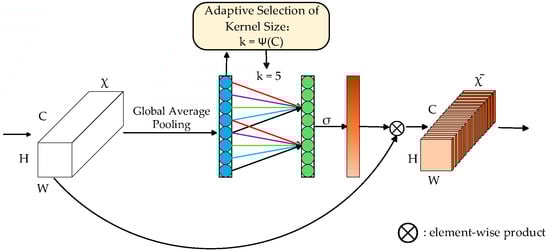 In this context, Wang et al. (2020) [23] proposed the Efficient Channel Attention (ECA) mechanism, which implements channel attention without requiring a fully connected (FC) layer. The network structure of ECA is depicted in Figure 4. The fundamental concept of the ECA module is to generate channel attention using adaptive one-dimensional (1D) convolution. Specifically, the ECA module first compresses the input feature map’s channel information into a one-dimensional vector via global average pooling. It then computes channel attention weights through an efficient 1D convolution operation. The kernel size of this 1D convolution is adaptively determined based on nonlinear mapping of the channel dimensions, allowing the model to effectively capture cross-channel dependencies at multiple scales. This approach eliminates the need for dimensionality reduction, thereby preserving critical channel-wise information. Finally, the computed channel attention weights are applied to the original feature map via element-wise multiplication, producing an output feature map with enhanced attention representation.