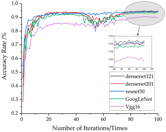 To evaluate the performance differences between DenseNet121 and other mainstream models, this study selected DenseNet201, ResNet50, GoogLeNet, and VGG16 as baseline models for comparison. Each model was trained for 100 epochs. To ensure robustness, each model underwent training five times with random initialization, and the mean accuracy was recorded. Figure 6 illustrates the accuracy curves of the five models during the training process.