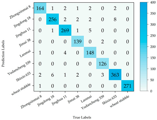 Specifically, the model exhibited the highest classification performance for wheat stubble, with all three evaluation metrics exceeding 99%. This superior performance may be attributed to the significant morphological differences between wheat stubble and mature wheat varieties. Among the seven wheat varieties, excluding wheat stubble, the proposed model achieved the best recognition results for Yudancheng 339, with an accuracy of 100%, a recall of 96.18%, and an F1-score of 98.05%.
