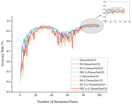 Figure 8 presents the results of the ablation experiments in a line chart format, systematically evaluating model variants by modifying key components and activation functions (as detailed in Table 4). Each modified architecture was trained and evaluated under identical experimental conditions. As illustrated in Figure 8, all the improved models exhibited similar accuracy trajectories during training. However, in the final training phase, the SECA-L-DenseNet121 model achieved significantly superior recognition accuracy compared to the other variants. A comprehensive quantitative evaluation of these models is summarized in Table 4. The results indicate that replacing the Leaky ReLU activation function with the ReLU activation function in the DenseNet model improved classification accuracy by 0.34 percentage points. Incorporating only the SE attention mechanism increased accuracy by 1.17 percentage points, while introducing only the ECA attention mechanism resulted in a 0.22 percentage point improvement. Notably, when both the SE and ECA attention mechanisms were applied simultaneously, along with replacing the activation function with Leaky ReLU, the model achieved a classification accuracy of 97.15%, representing a 2.13 percentage point increase compared to the baseline DenseNet model.