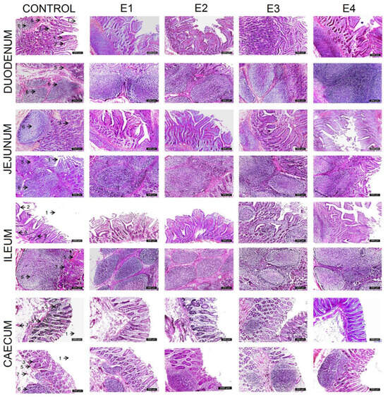 The mucosa of the jejunum and ileum is thicker due to the accumulation of different lymphoplasmacytic populations in the lamina propria. These cells can be found from Lieberkühn’s glands to the tips of the villi. The submucosa is more prominent due to the accumulation of lymphoid follicles, which are large enough to pass through the muscularis mucosae and act as an immune barrier to the intestinal wall. Peyer’s patch sizes, both in the jejunum and ileum, were significantly larger in E3 (10 gGP/kg) compared to the control and the rest of the experimental groups (p < 0.001). Lymph node sizes decreased in the following order: E2 (5 gGP/kg), E4 (15 gGP/kg), E1 (1 gGP/kg), and control.